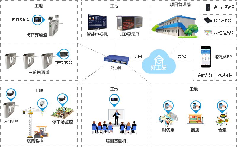 好工易劳务用工管理系统主要由实名制、进出场考勤、劳务分析、黑白名 单库、电子档案库、工资管理等模块组成。