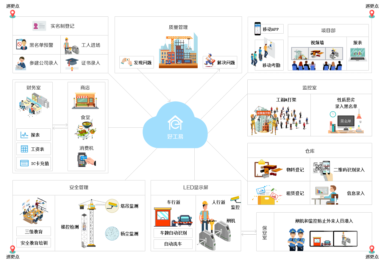 对于工程的质量的把控,好工易也有自己的质量管理系统,问题整改系统对这方面进行把控,通过对计划进度和实际进度的及时反馈和把控,让管理人员及时知道项目上的情况,对于项目工地上发现的问题及时进行整改从而达到提升工程质量的目的。由于项目上人员流动比较大,项目工地的保安很难确保外面的人混进项目工地,项目工地上出现盗窃和材料损坏的事情也时有发生,更有甚者外面的人在项目工地上自杀或者产生意外以后,其家属强行将责任推给项目工地,敲诈项目工地,有的项目工地由于管理上存在漏洞极有可能就让他们得逞了,最终给建筑企业造成很大的损失和不好的社会影响,对此好工易的考勤系统和劳务系统通过门闸,考勤机等设备能有效的防止非项目工地人员混入项目工地,同时好工易的考勤系统也可以生成报表和图表,让管理人员可以轻松掌握每个工人每天的考勤和工作情况便于管理人员管理工人。针对项目工地上的安全,好工易采用的是自己研发的安全管理系统,对塔吊,扬尘等设备的安全性进行实时监测,以防出现意外。